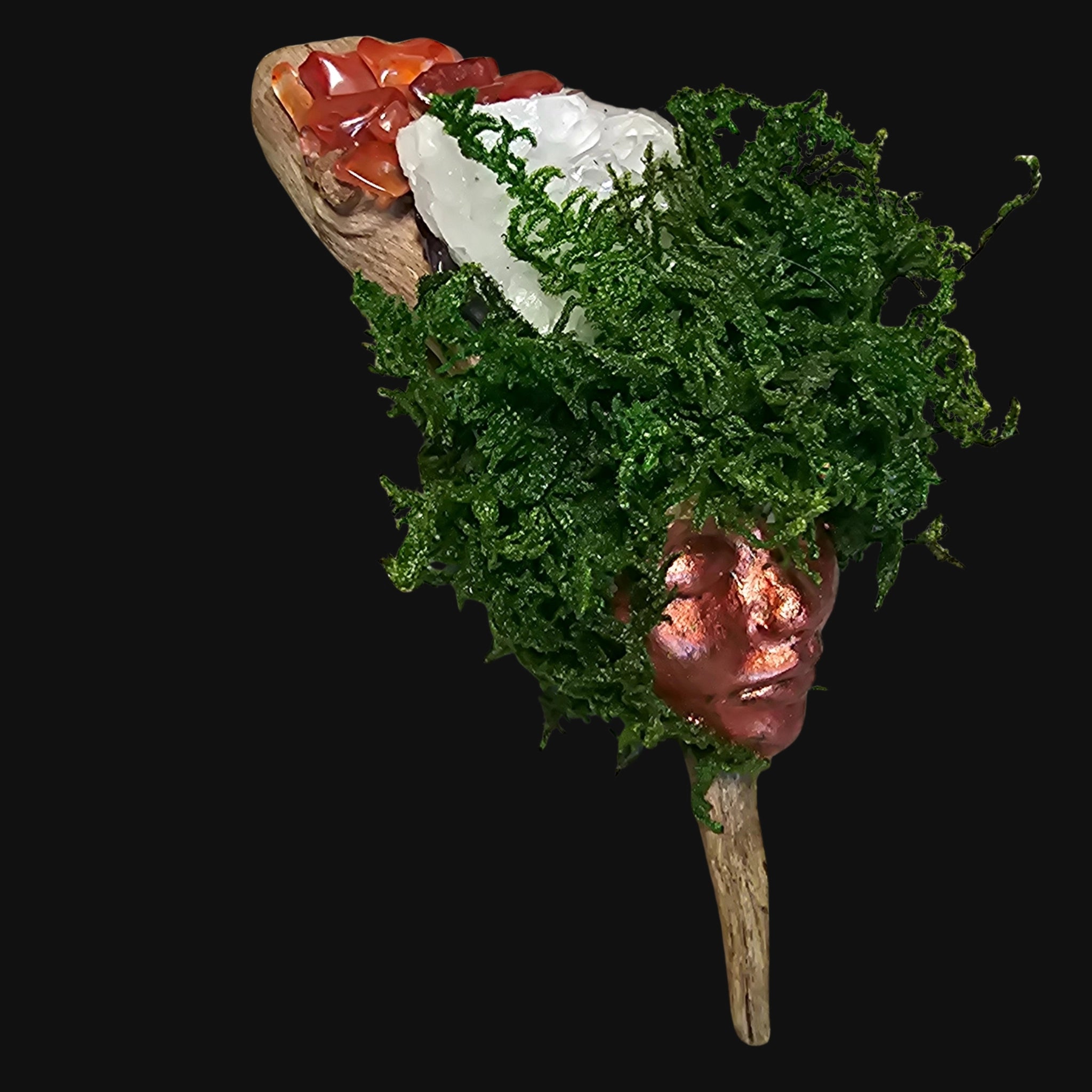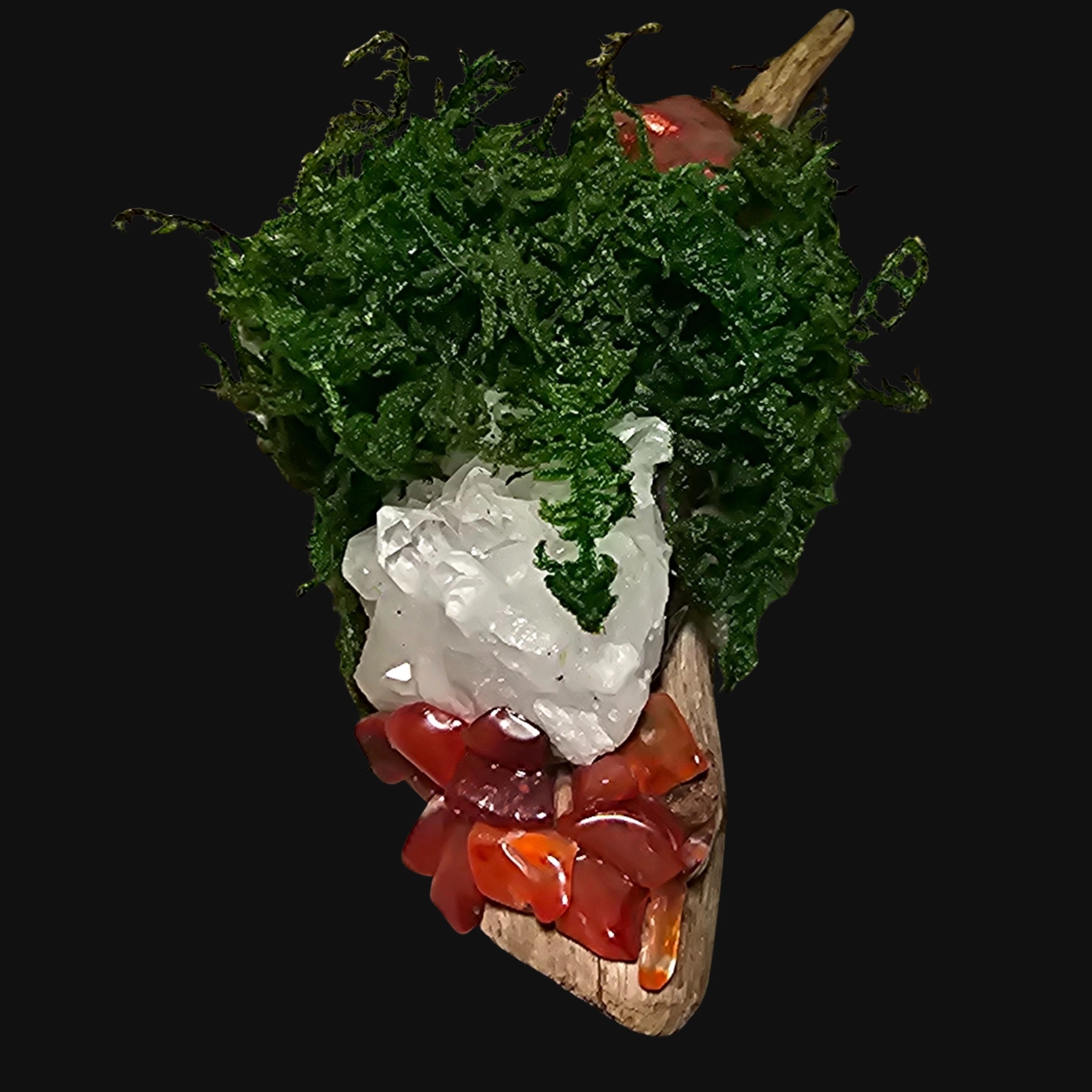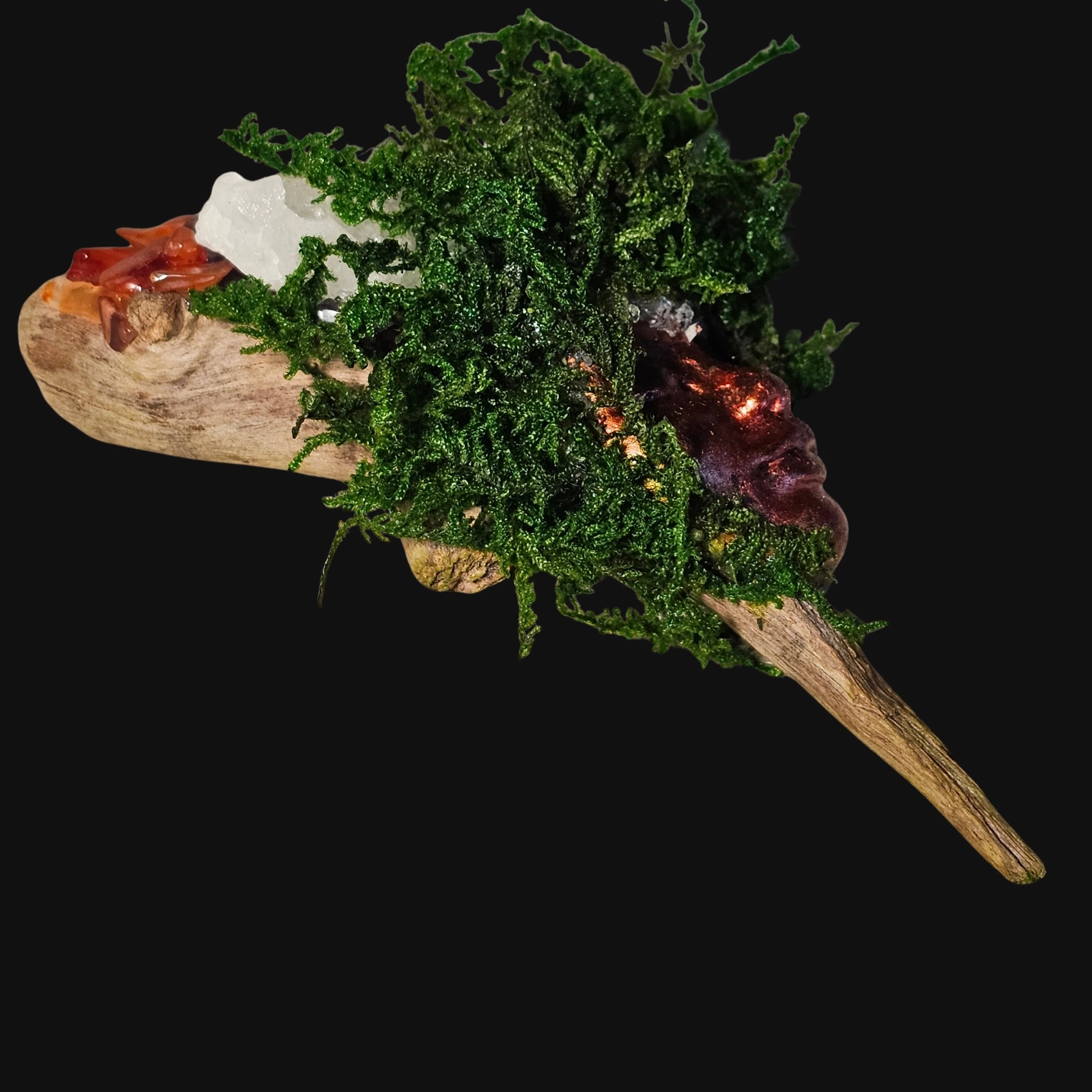 Set upon driftwood and crowned in moss, she holds the warmth of renewal within form.