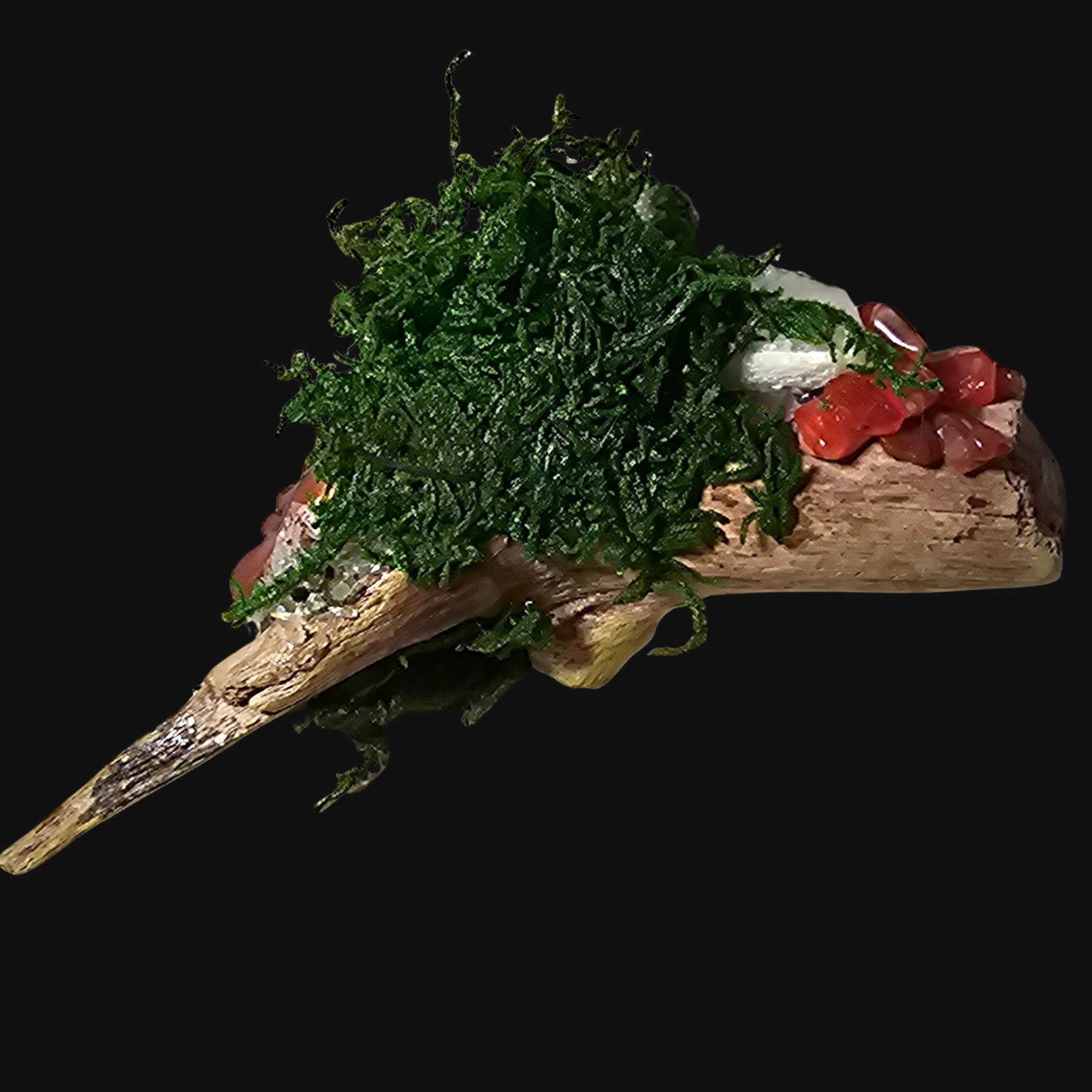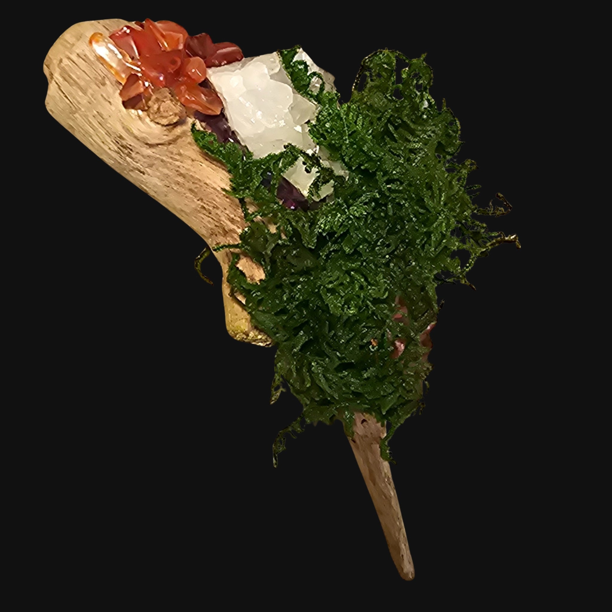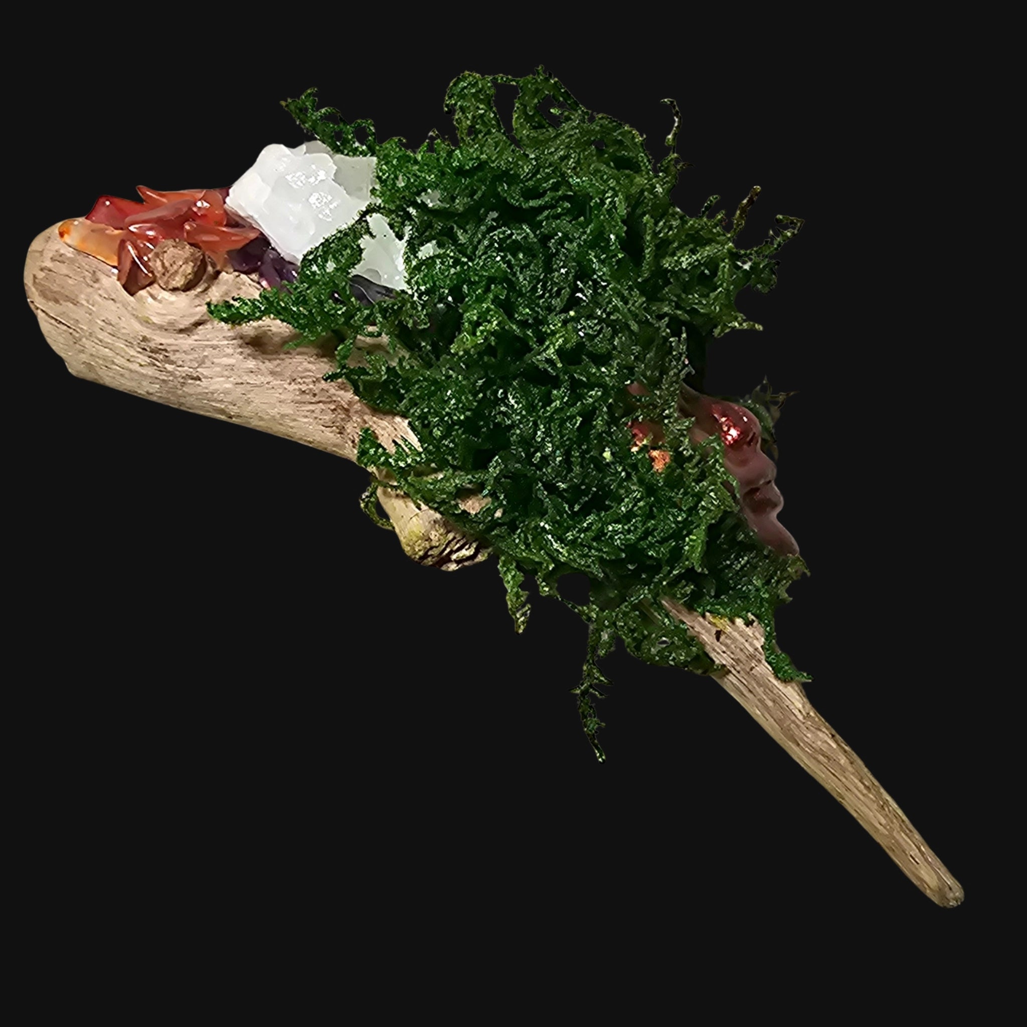 Set upon driftwood and crowned in moss, she holds the warmth of renewal within form.