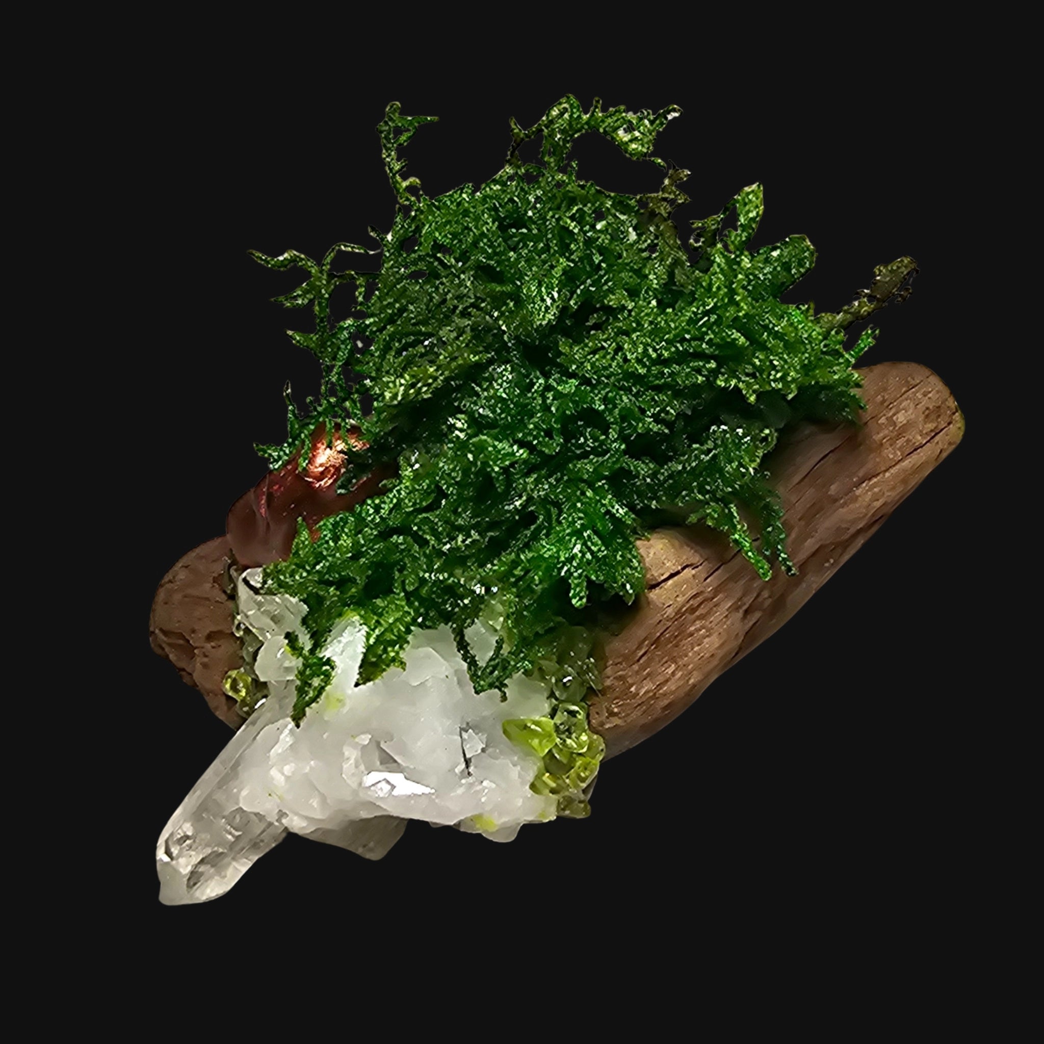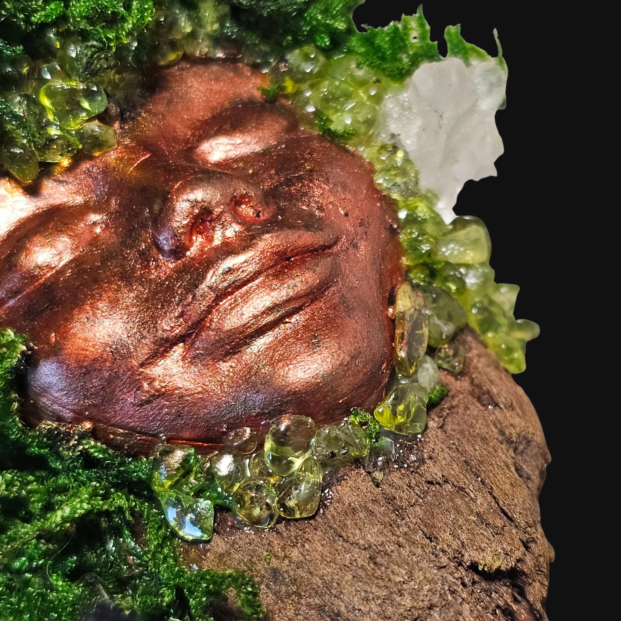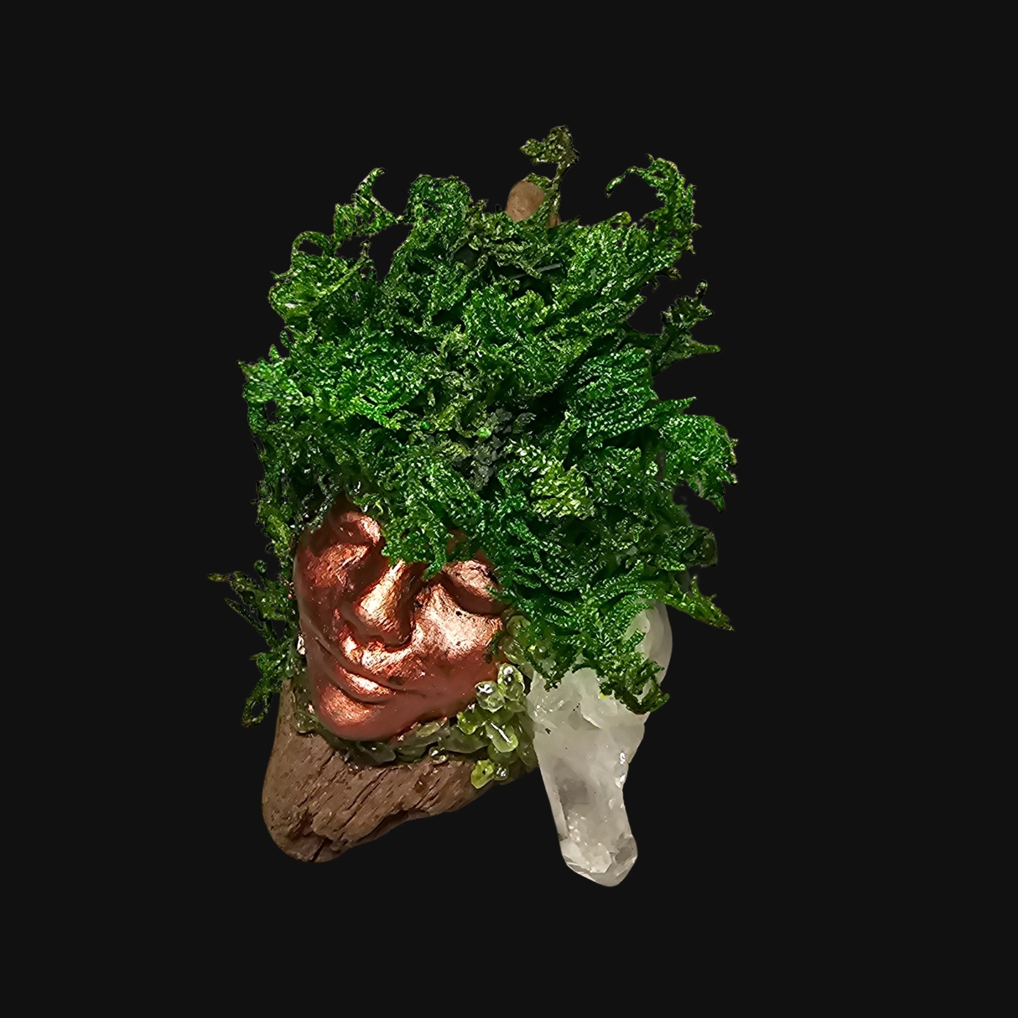 Set upon driftwood and softened with moss, her form holds the quiet rhythm of the earth.