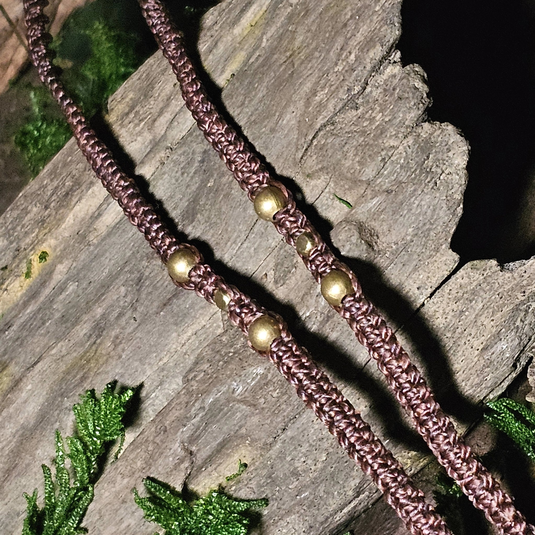 Handwoven in deep brown waxed cord with brass bead detailing.