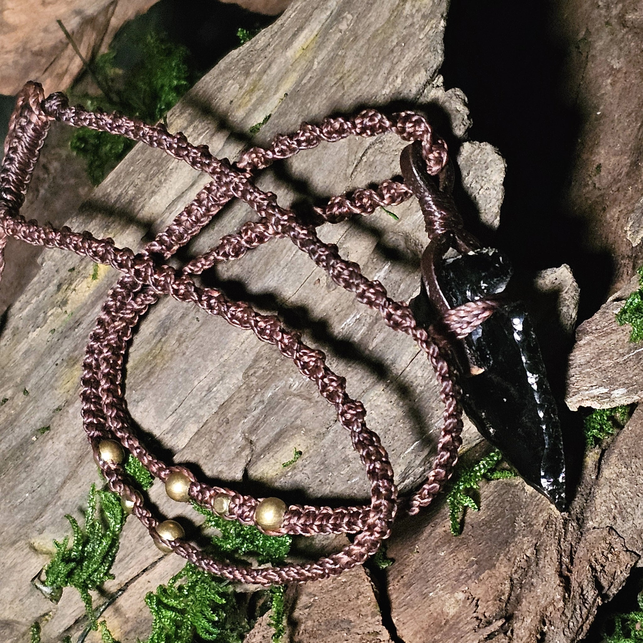 Carved into form and held in handwoven cord, this black obsidian arrowhead channels the raw energy of earth and shadow. A talisman for grounding and psychic defence, it supports those who walk between worlds — shielding energy, cutting through illusion, and anchoring clarity in chaos.