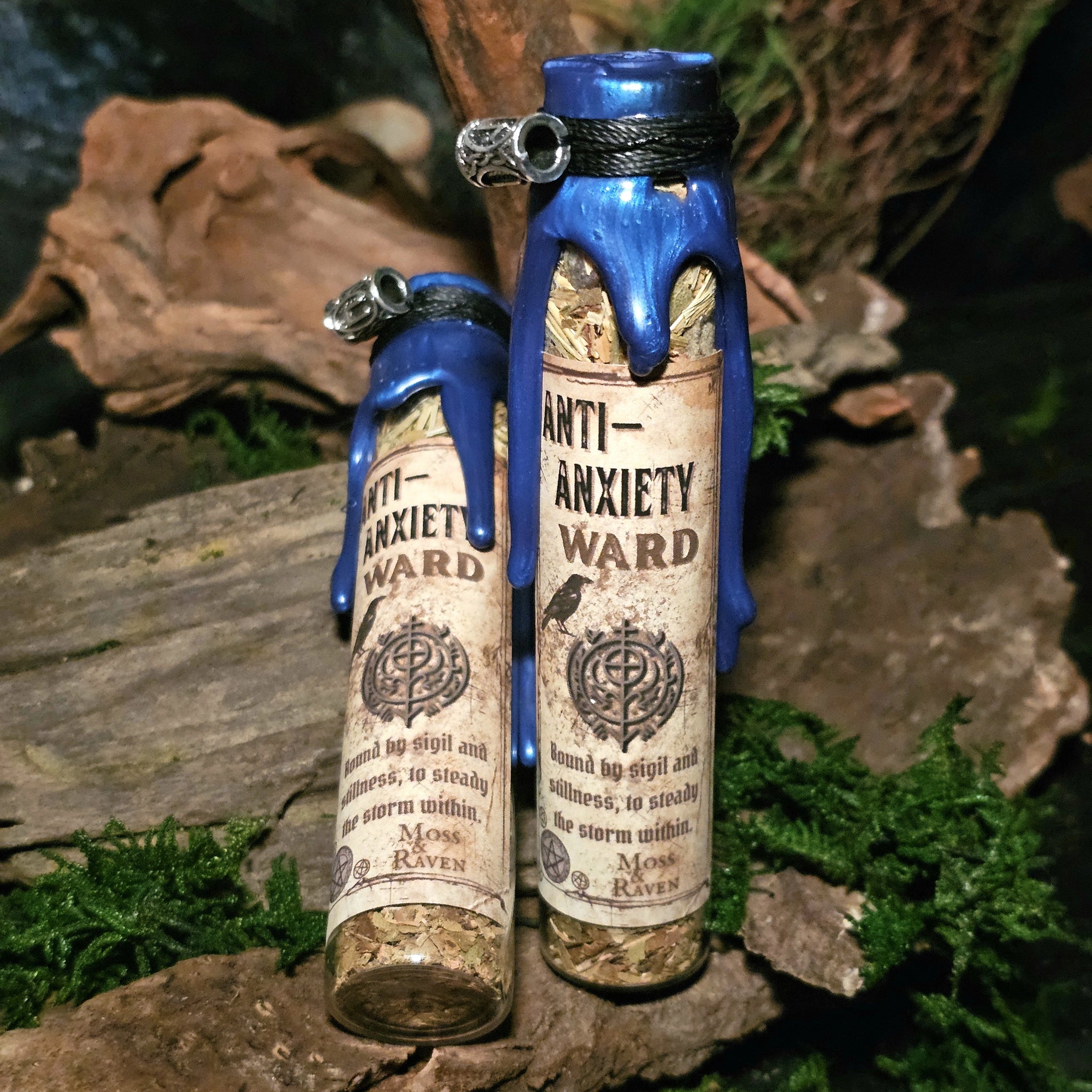 Crafted for the days when the world hums too loudly, the Anti-Anxiety Ward is a quiet protector — a blend of calming plant allies and crystal presence woven to steady the breath, ground the spirit, and quiet the storm within.