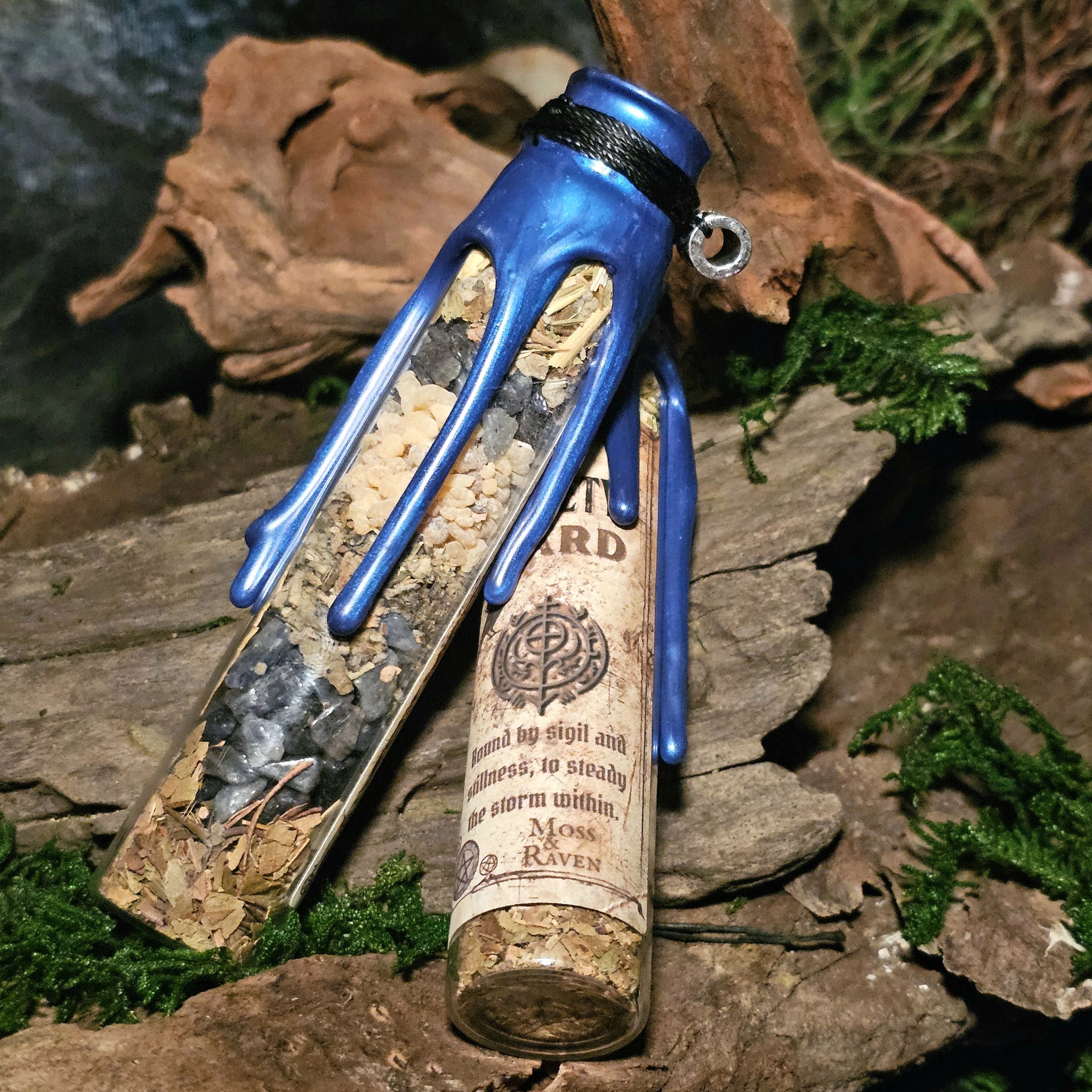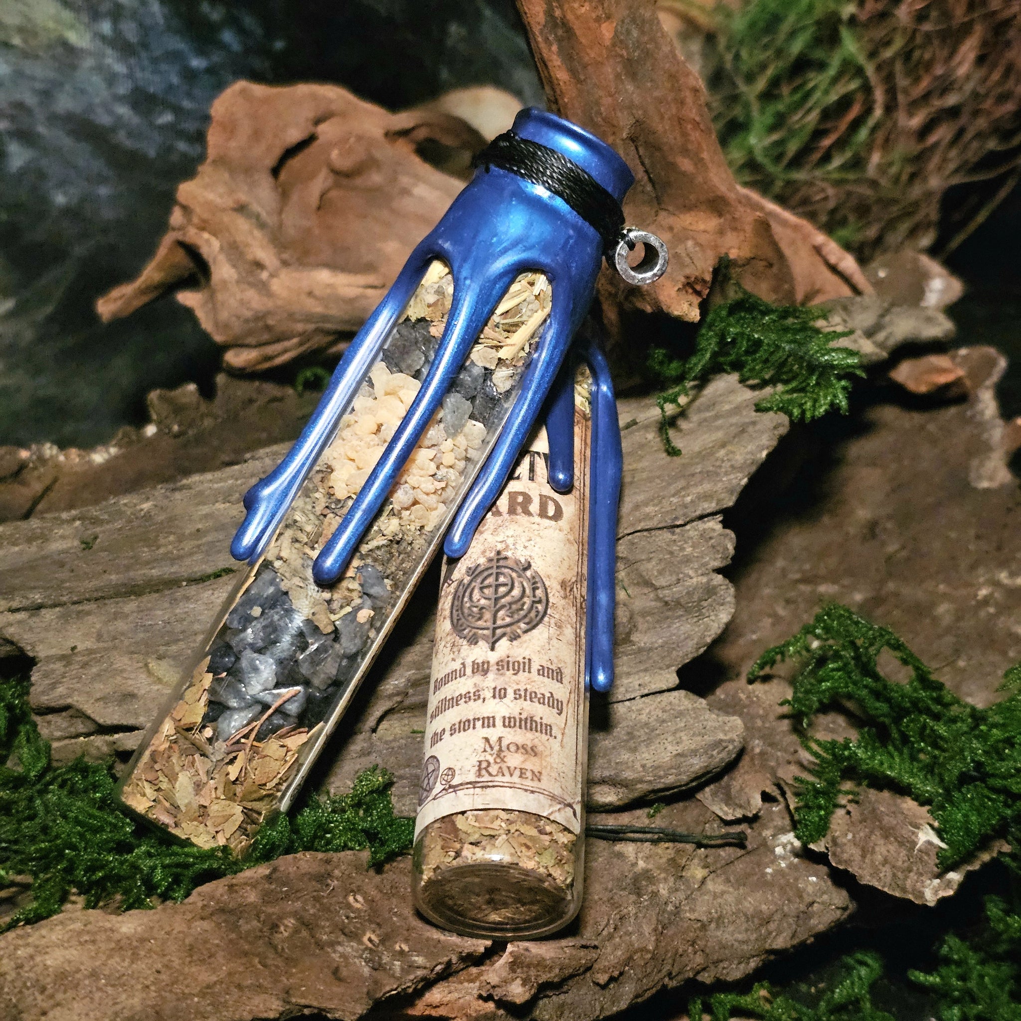 Inside, frankincense clears tension and sanctifies space, oat straw and lemon balm soothe the nervous system, agrimony eases unspoken burdens, and bay leaf seals protective calm. Blue quartz rests at the centre, softening spirals of thought into stillness. Every element has been chosen for its true correspondence — nothing added for appearance alone, then ritually charged and sealed.